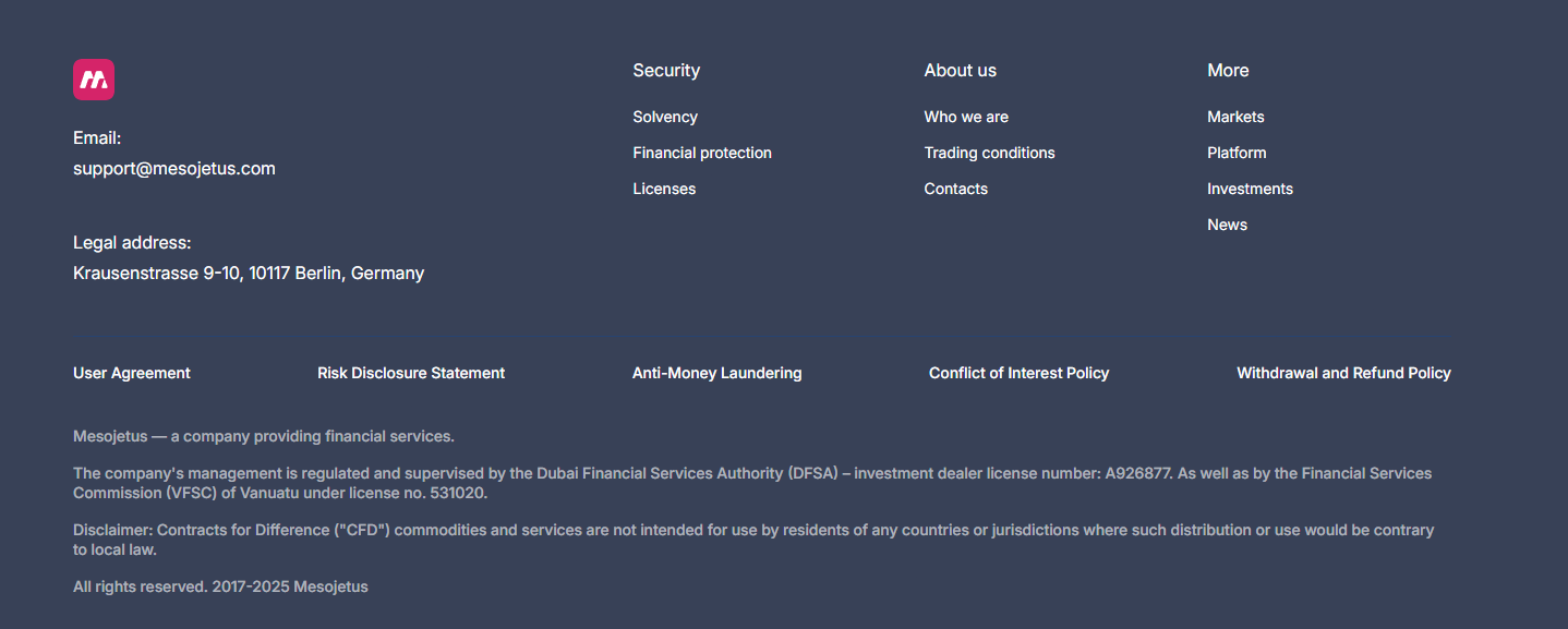The license numbers listed on the website could not be verified in the official registers of these authorities. The company is not licensed in any of the mentioned jurisdictions. Searches in the FCA, DFSA, and BaFin databases show no registration for Mesojetus.