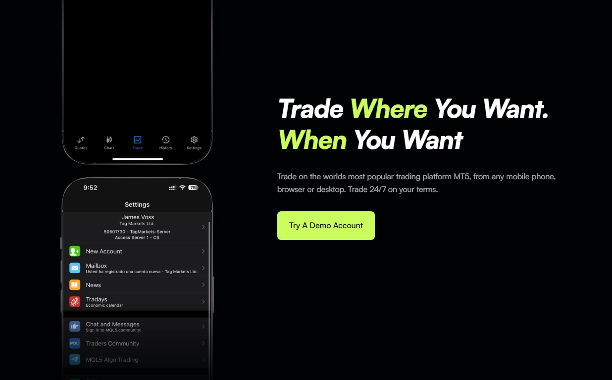 Tag Markets offers access to MetaTrader and its own internal trading platform. The broker promotes fast execution, real-time pricing, and reliable trade processing. However, critical details such as execution type (ECN, STP, or dealing desk), liquidity providers, spreads, and fees are not disclosed. Without this information, traders cannot assess the fairness or true cost of trading.